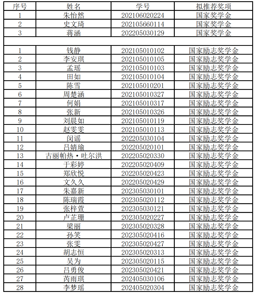 根据《徐州医科大学本科生国家奖学金管理实施细则》、《徐州医科大学本科生国家励志奖学金管理实施细则》文件精神及学校《关于做好2025年国家奖学金和国家励志奖学金评审工作的通知》要求,经学生个人申报、班级评议、学生答辩、学院评审等环节,拟确定朱怡然等3名同学为2025年本科生国家奖学金推荐对象,钱静等28名同学为2025年本科生国家励志奖学金推荐对象,现予以公示,名单详见下表。