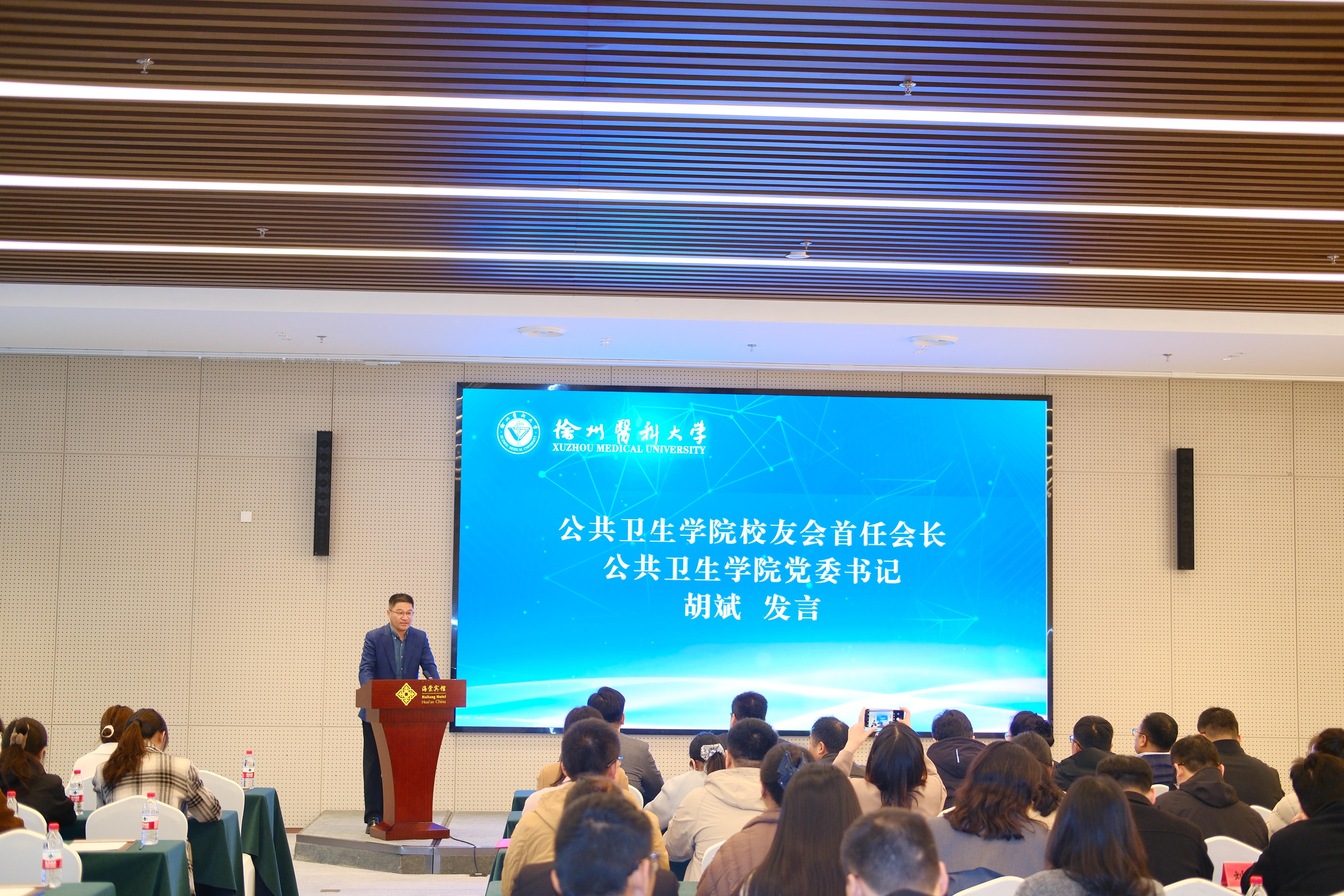 校友会首任会长、公共卫生学院党委书记胡斌发言,他向全体与会代表介绍了学院近年来取得的成绩,代表学院向长期以来关心、帮助和支持学院建设发展的各位校友表示感谢。他指出,校友会的成立旨在凝聚校友力量,打造合作平台,推动学院高质量发展。未来期待校友提供实习就业指导、科研合作、资源链接和助学支持,深化“勤勉、笃行、创新、求真”的院训精神,共筑公共卫生事业新篇章。