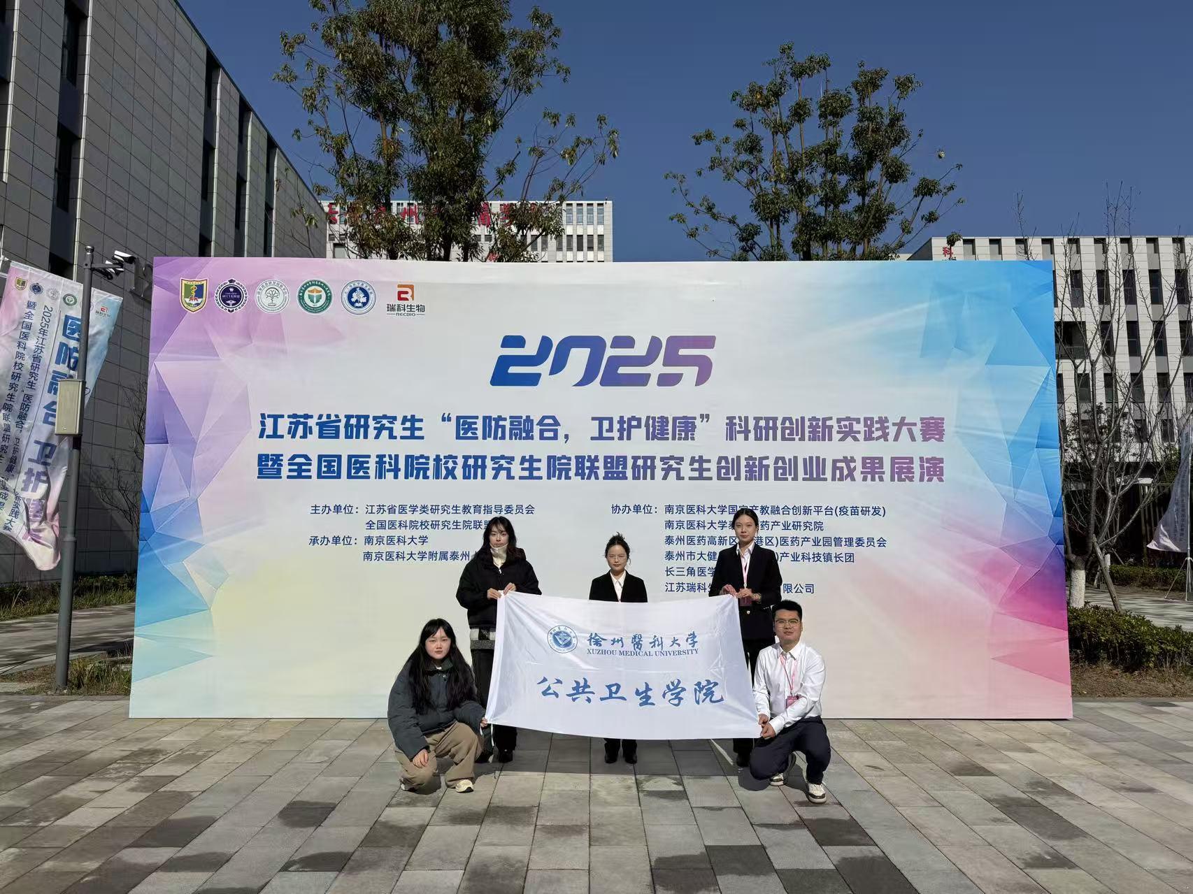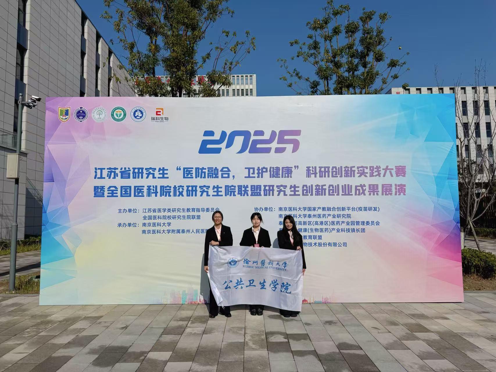 2025年12月14日,由江苏省医学类研究生教育指导委员会和全国医科院校研究生联盟主办,南京医科大学和南京医科大学附属泰州人民医院承办,长三角医学教育联盟协办的2025年江苏省研究生“医防融合,卫护健康”科研创新实践大赛暨全国医科院校研究生院联盟研究生创新创业成果展演在南京医科大学附属泰州人民医院举行。经激烈角逐,我院2项作品在大赛中脱颖而出,分别荣获特等奖和三等奖。