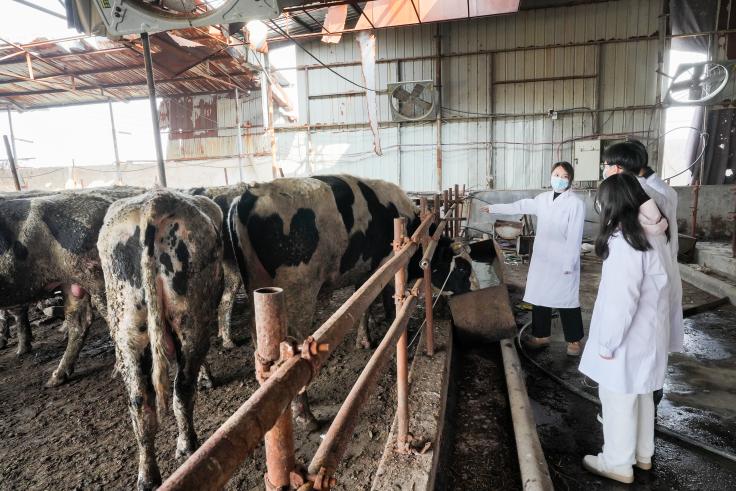 团队走进师寨镇的3家规模化牛场,实地参观圈舍环境,详细了解养殖规模、日常管理、消毒防疫等情况,系统梳理防疫盲区。志愿者们仔细观察圈舍通风、粪便处理、饲料存储等环节,与养殖户深入交流疫病防控中的难点。结合现场发现的问题,从圈舍消毒频次、新进牲畜隔离、人员防护规范等方面提出具体建议,帮助养殖户优化防疫流程。团队负责人齐欣如表示:“只有蹲得下身子,才能看得清问题;只有摸得透实情,才能开得出良方。”