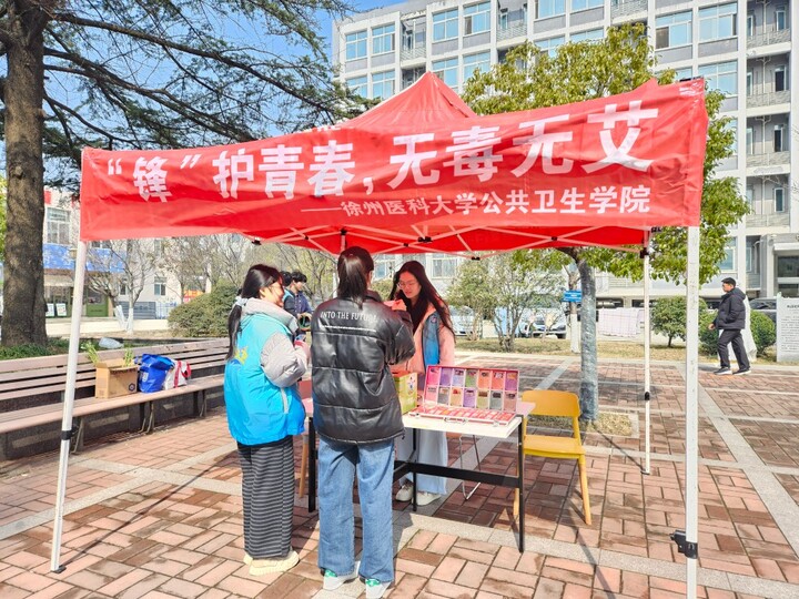3月6日,志愿队在徐州医科大学主校区青年广场举办“‘锋’护青春,无毒无艾”禁毒防艾主题宣传活动。志愿者们通过图文展板、仿真毒品模型展示、有奖知识竞答等形式,向师生系统普及禁毒与防艾知识。针对吸毒与艾滋病传播的高度关联性,志愿者从共用针具、免疫力下降等角度深入讲解,引导青年学生树立“拒绝毒品、主动防艾”意识。